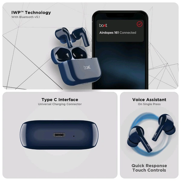 The boAt Airdopes 163 are true wireless earbuds offering a comfortable and secure fit with ear hooks. They provide a total playback time of up to 40 hours, including the charging case, and feature ENx™ Technology for clear calls. The earbuds boast 13mm drivers for immersive sound and are IPX5 rated for water and sweat resistance, making them suitable for workouts. They also support ASAP™ Charge, providing significant playtime with a short charging time, and offer seamless Bluetooth connectivity.